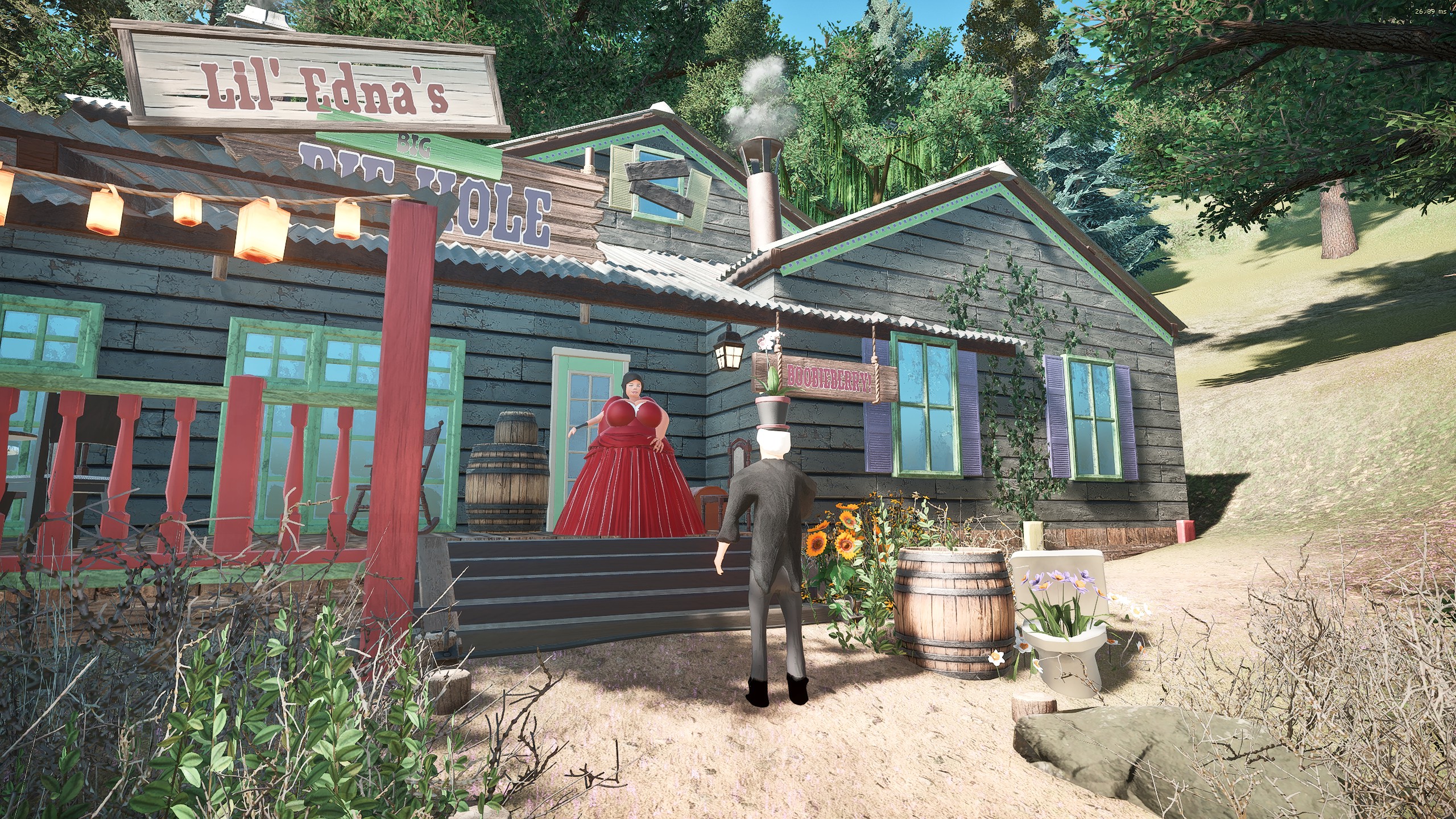 And that's what she did. On her thirteenth birthday, Mama put a blindfold on Little Edna and led her across the footbridge to the wooded empty peninsula across from the camp, and when the blindfold came off her daughter could not believe her eyes and squealed with delight: A modest structure to be sure, but the words "Little Edna's Pie Hole" were right there in great big letters.